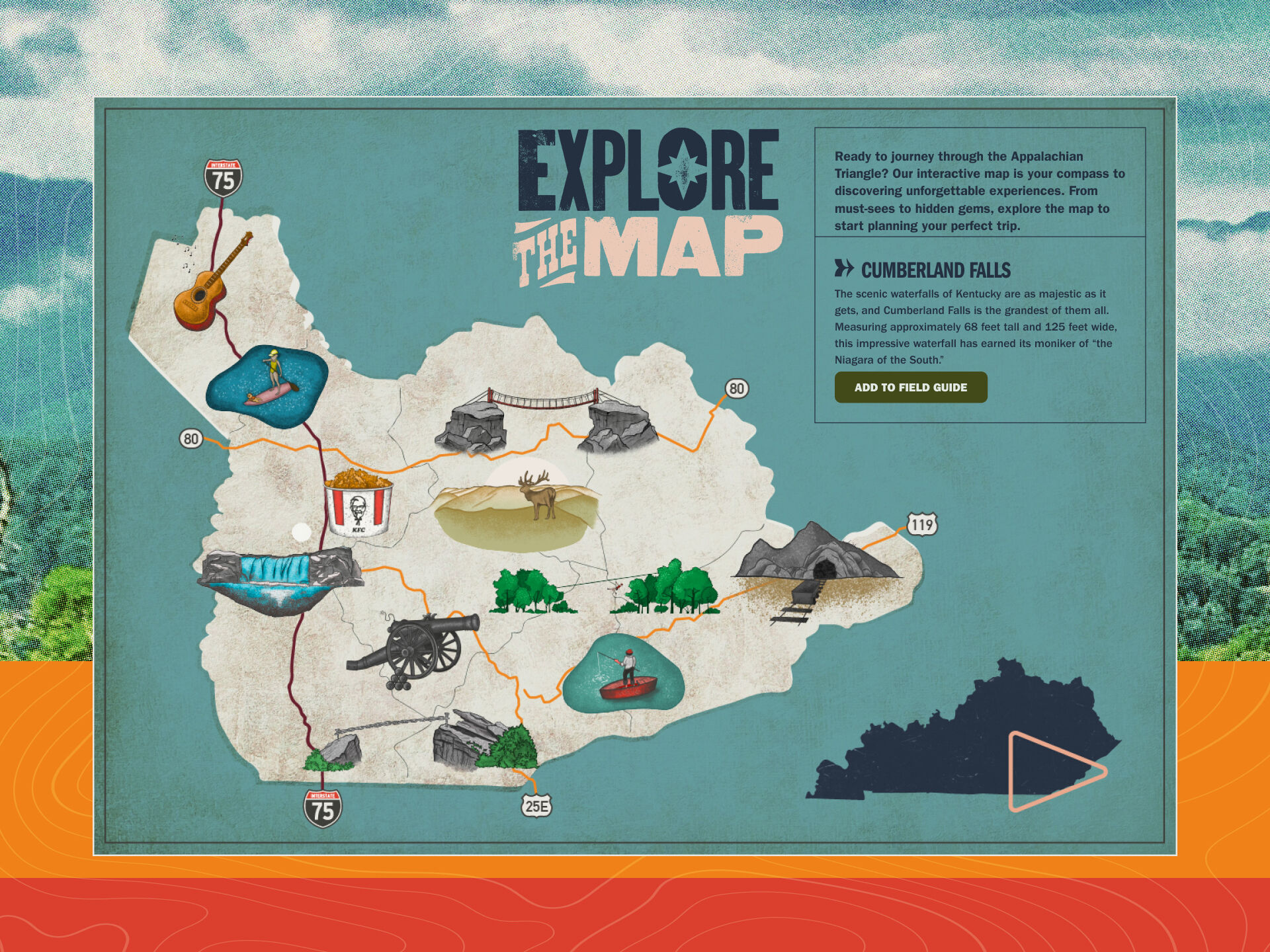 To bring the brand to life, we created a rich visual identity that celebrated the spirit of the region—rugged, authentic, and welcoming. We collaborated with local letterpress artist Brad Vetter to design the logo and custom typography, adding texture and handcrafted warmth to the digital experience. Each archetype received its own illustrated badge, creating a playful system of icons that guided users and reinforced the brand’s narrative. Our team also produced a beautiful video we shot in Appalachia to bring movement and emotion to the homepage.